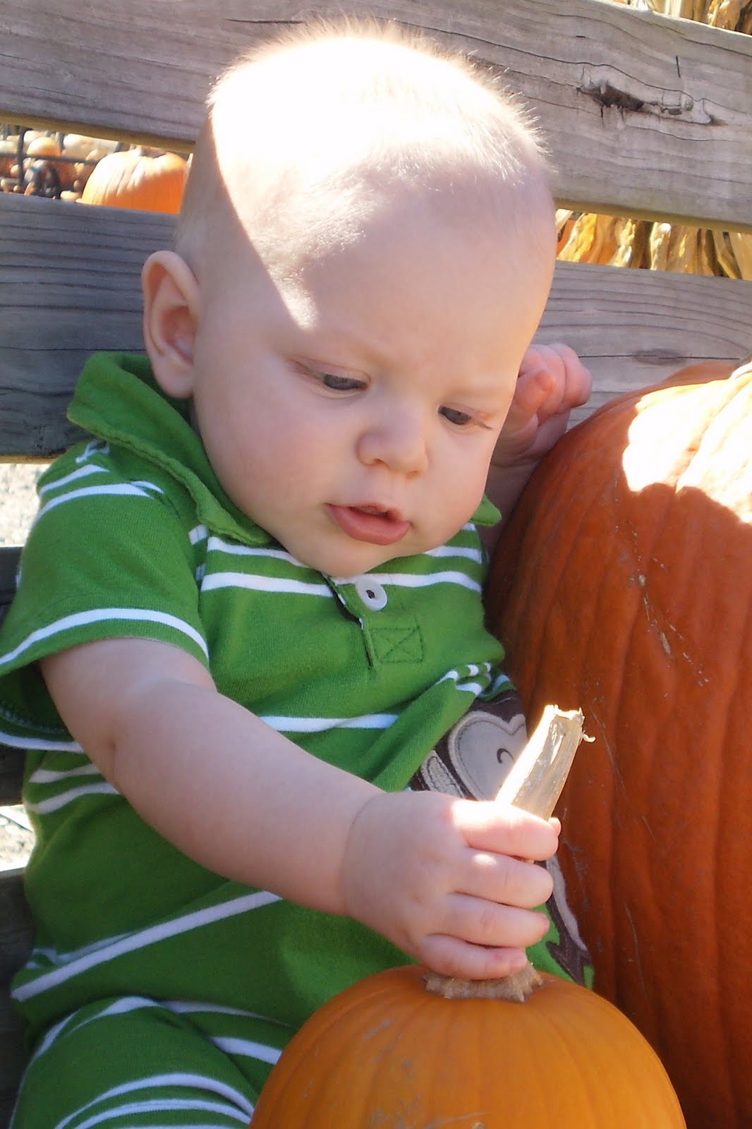 We made two attempts at visiting a pumpkin patch in the past week. The first time, Chase was on the verge of a nap, grumpy, and it was ridiculously hot outside, so we left pretty quickly. On the second attempt, we dressed more appropriately, and tried to get there at a better time of day. He still tried to nap on the way, but woke up after the first few pictures, and I think we got some pretty cute ones, if I do say so myself. Take a look.